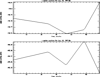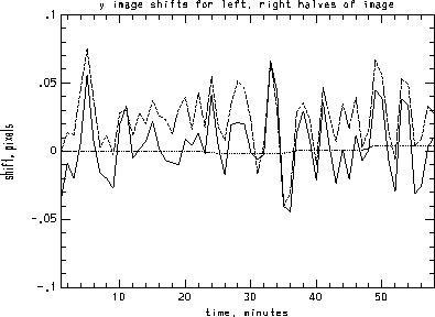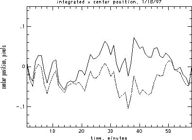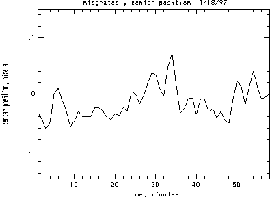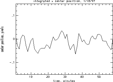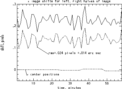 I analyzed one hour of data from Jan. 18, 1997. It was high-res data and all references to pixels are high-res pixels. The dataset is 1024x500 and so split nicely into two pieces of 512x500 in size. The center positions from the header have a variation of about 0.05 pixels over this time period. One issue is whether these variations are real image motion or are errors in the measurements.