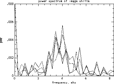 The cross correlation between two images is sharply peaked, which I attribute to granulation. These peaks were fit to a gaussian and the shifts measured in x and y for the hour. Also shown is the first difference of the center positions from the header, which should be comparable to these measurements. We should expect an offset in x of about 0.25 pixels but it is not clear why the measured offsets for the two halves are not the same. From the high correlation between analyses done for the two halves separately, it is clear that we are seeing real image motion. The power spectrum of these signals shows a clear p-mode signature, indicating that the p-modes on the limb sensors as a likely source of the variation.